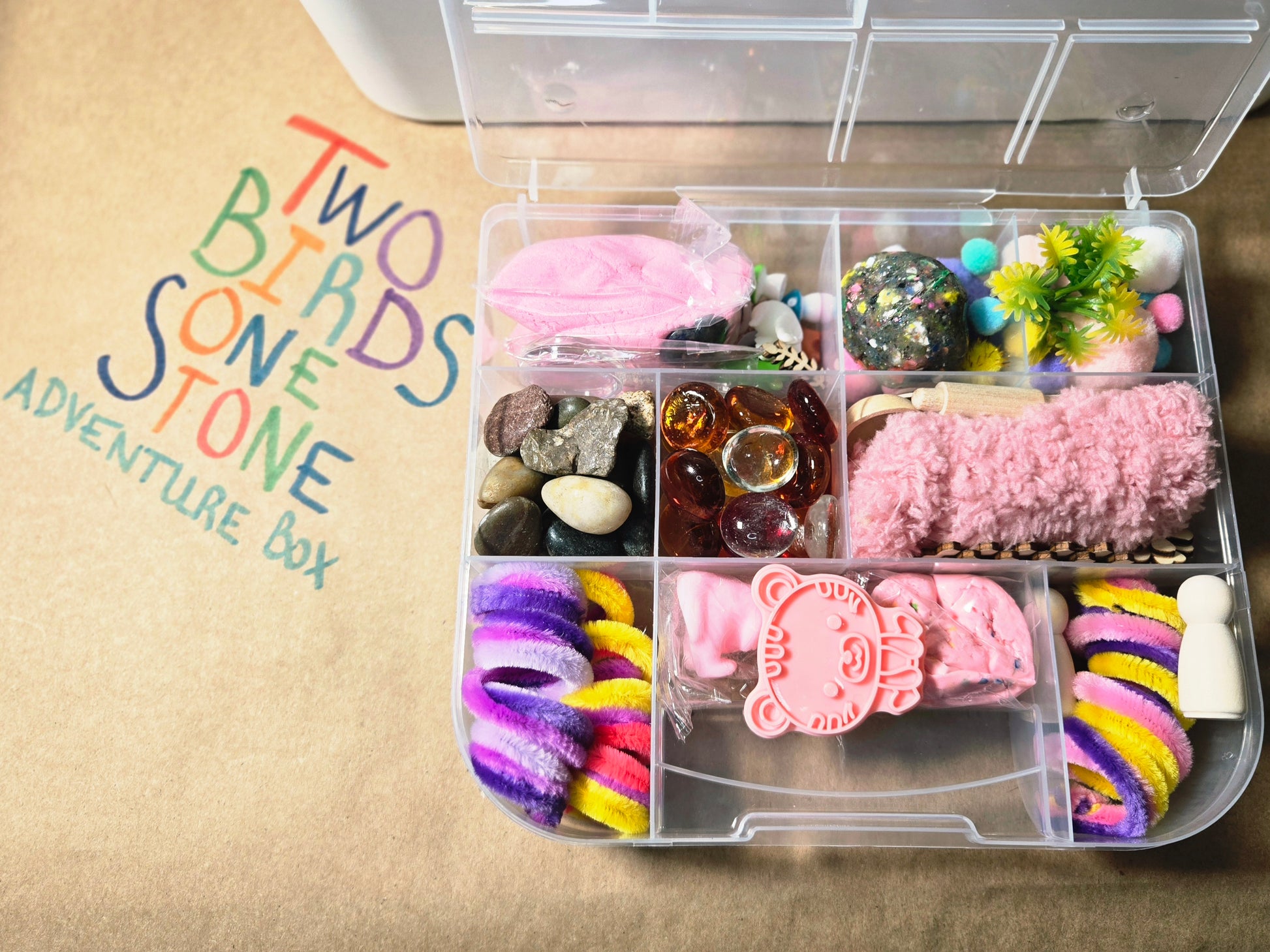 Each box encourages imagination, sensory play, and learning through scene-building with magic sand, play-doh, rocks, gems, marbles, fuzzy textures, and real exploration tools like magnifying glasses.